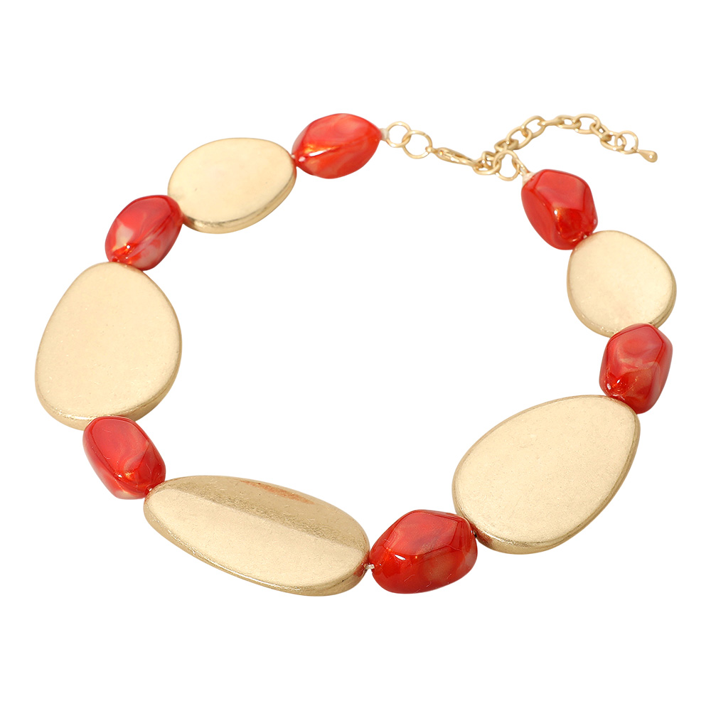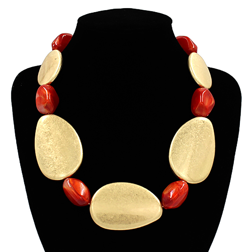 Bold Brushed Metal Plate Marbled Pebble Beaded Statement Necklace