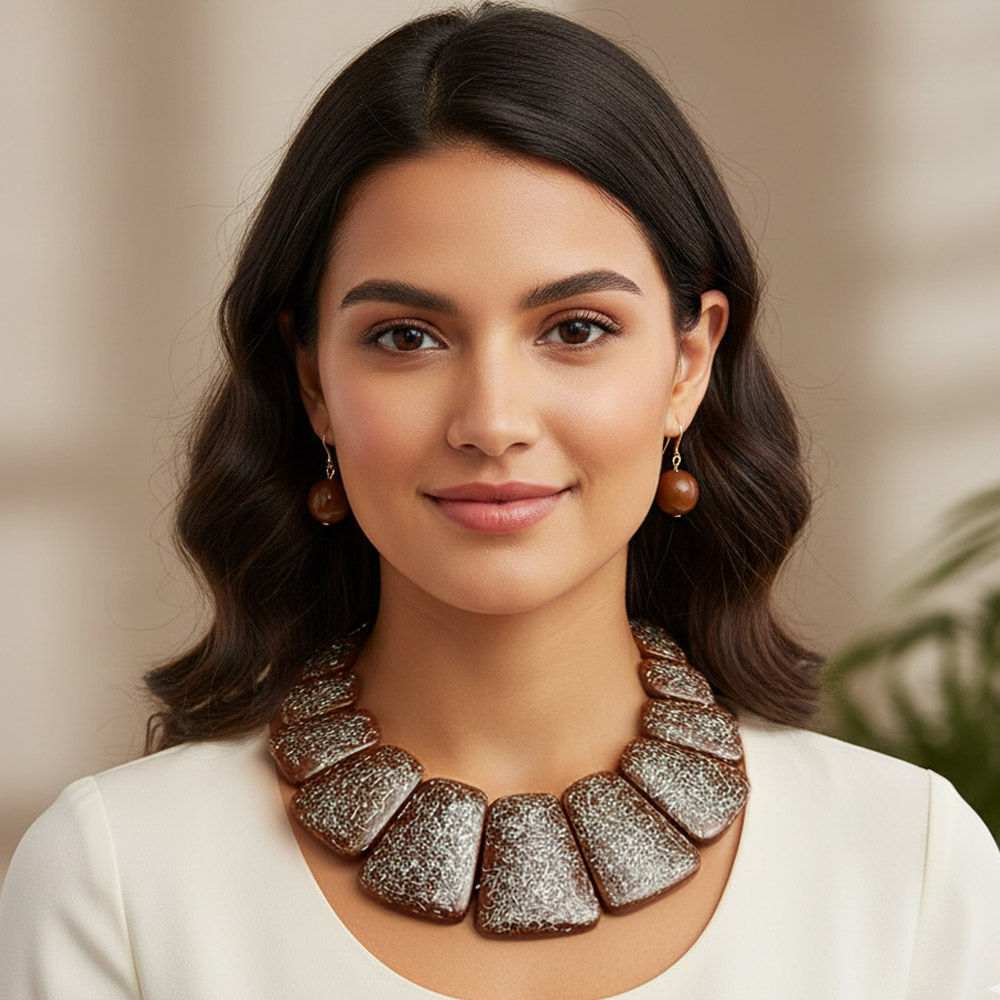 • Bold statement collar necklace featuring wide textured panels arranged in a tapered design for an artistic, modern look. Perfect for elevating evening outfits, formal wear, or adding a striking focal point to everyday ensembles.