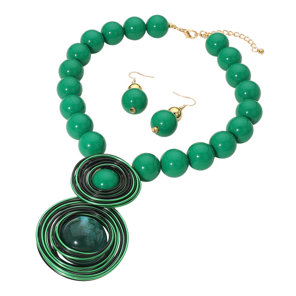Details • Necklace Size : 17.5" + 3" L • Decor Size : 3.75" L • Earrings Size : 2.25" L • This statement beaded necklace and earring set delivers bold, coordinated style with a striking pendant design and matching drop earrings. Created to elevate everyday outfits or complete dressy looks, this set is ideal for gifting, boutique collections, and trend-driven displays. A versatile accessory that adds polished impact to any jewelry assortment. • Lead and Nickel Compliant