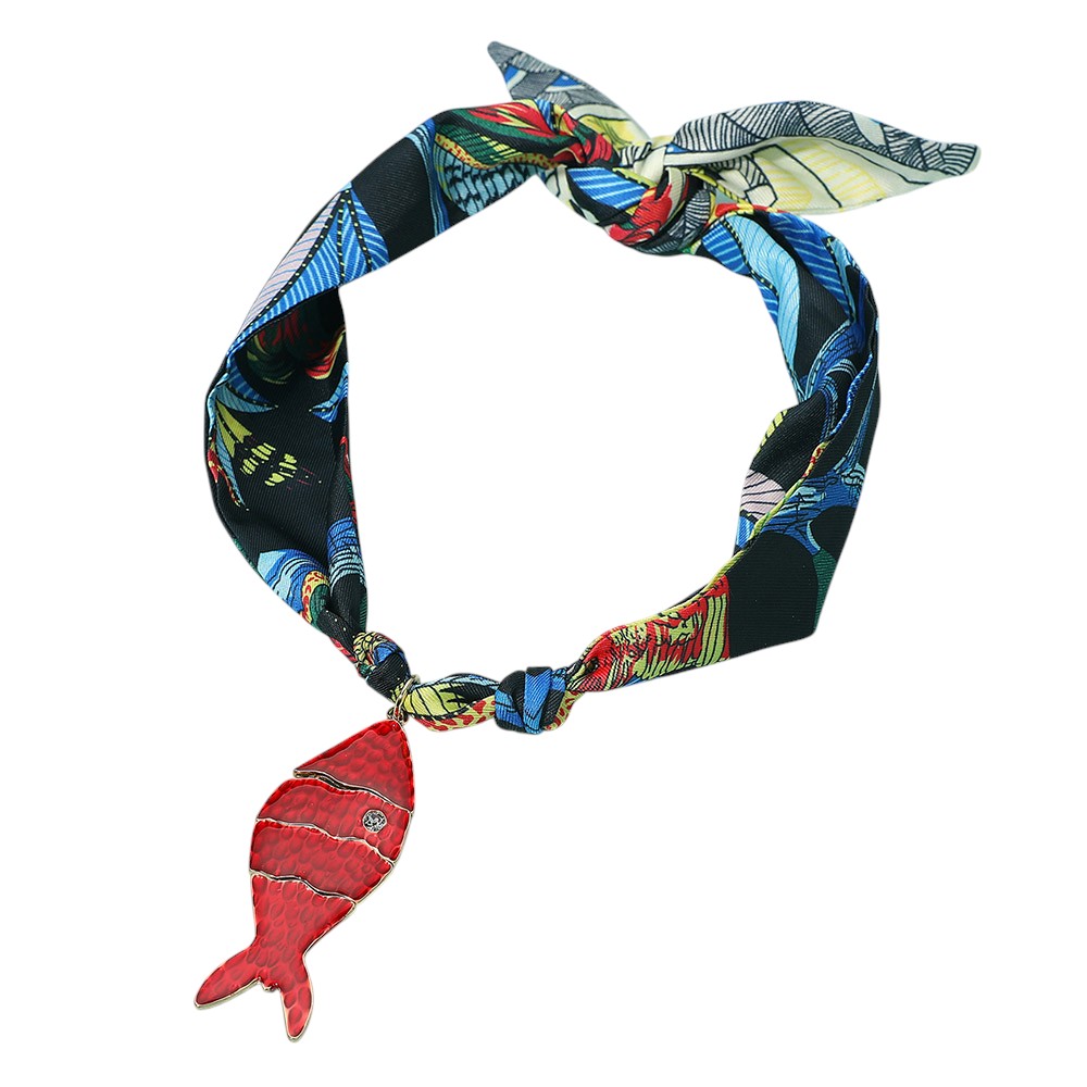 Details • Necklace Size : 30" L • Pendant Size : 1.4" X 3.4" • Print may vary • Make a statement with this unique scarf necklace featuring a colorful patterned fabric tied with a bold red fish pendant. Perfect for beachwear, summer outfits, or festival looks, this ocean-inspired accessory combines playful charm with stylish versatility for a standout coastal jewelry piece. • Lead and Nickel Compliant