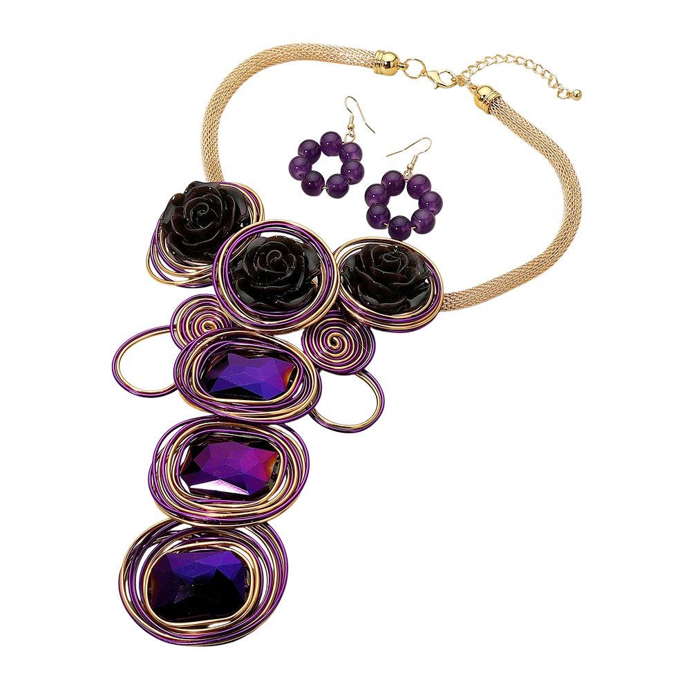 Details • Necklace Size : 19" + 3" L • Decor Size : 7" L • Earrings Size : 2" L • This bold statement necklace and earring set showcases an artistic blend of floral motifs and faceted gem accents. Designed to stand out, it adds dramatic elegance and creative flair to any outfit, making it the perfect accessory for special events or evening glamour. • Lead and Nickel Compliant