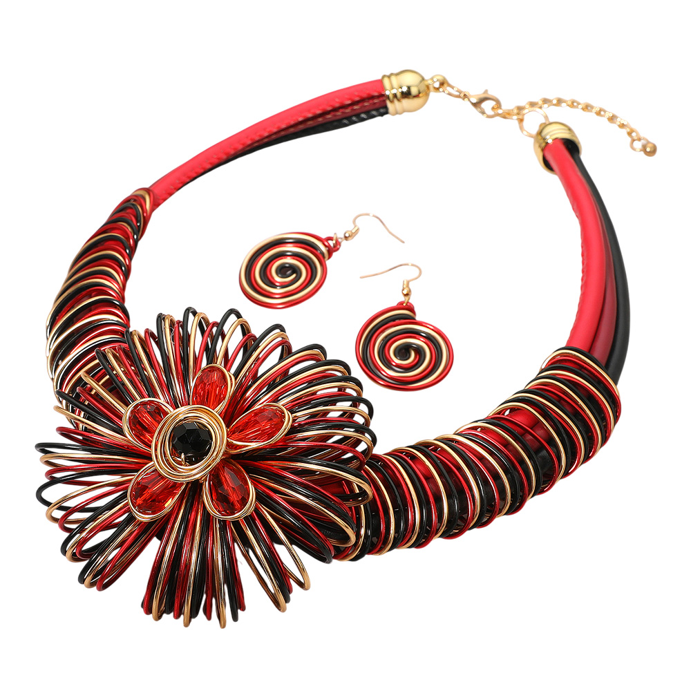 • Make a bold fashion statement with this exquisite necklace and earring set, featuring a large flower centerpiece with layered loops and crystal accents. Paired with spiral drop earrings, this set adds artistic flair and contemporary charm to any elegant or casual outfit.