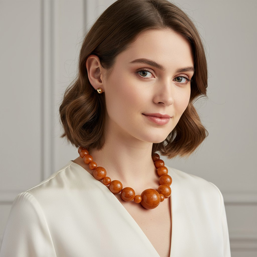 • Enhance your outfit with this glossy round beaded necklace and matching stud earring set. The graduated bead design adds depth and balance, while the adjustable chain ensures a perfect fit. Ideal for creating a bold yet elegant statement that transitions effortlessly from day to night.