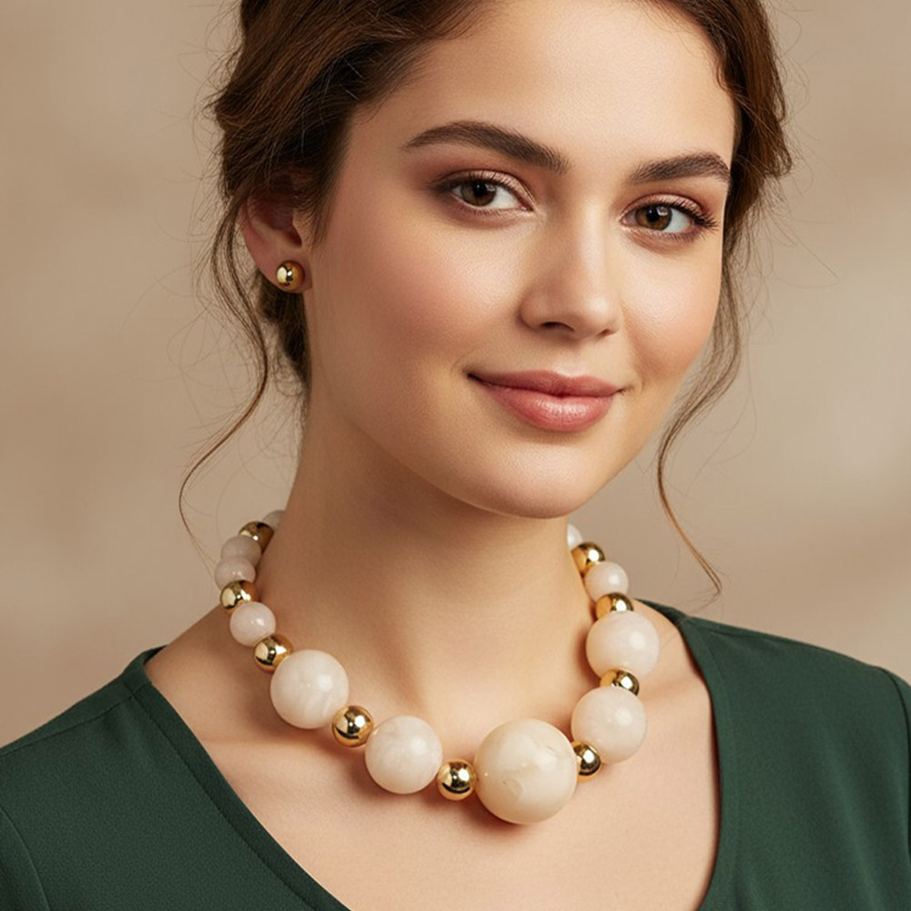 • Elevate your style with this two-tone beaded statement necklace and stud earring set. Featuring glossy round beads in alternating finishes, it brings a touch of refined glamour to any outfit. Perfect for both casual and formal looks, this set adds bold sophistication and timeless charm.