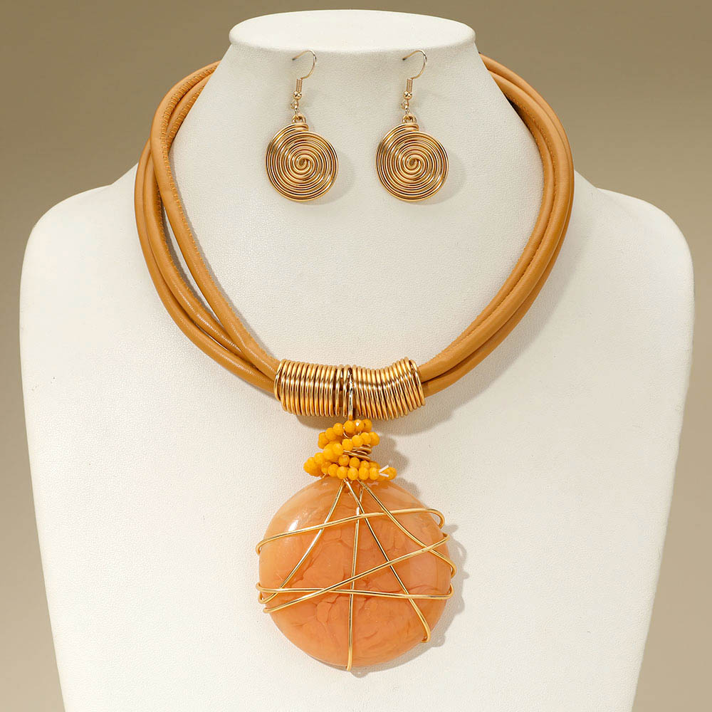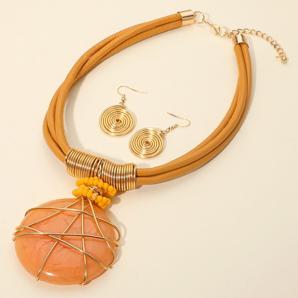 Details • Necklace Size : 19.25" + 3" L • Pendant Size : 2.75" X 3.5" • Earrings Size : 2.25" L • Make a striking impression with this bold statement necklace featuring a large round pendant wrapped in metallic accents and paired with matching spiral earrings. Perfect for elevating evening outfits or adding artistic flair to casual looks, this set is designed to turn heads with modern elegance. • Lead and Nickel Compliant