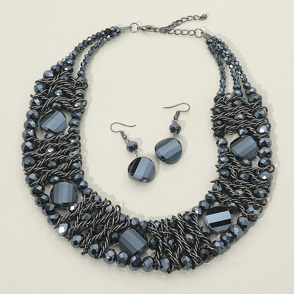 • Bold multi strand statement necklace set featuring layered faceted bead detailing with matching drop earrings. Designed for boutique styling, evening outfits, and special events, this coordinated jewelry set delivers eye-catching texture, dimensional shine, and elevated impact for dresses, blouses, and occasion-ready looks.