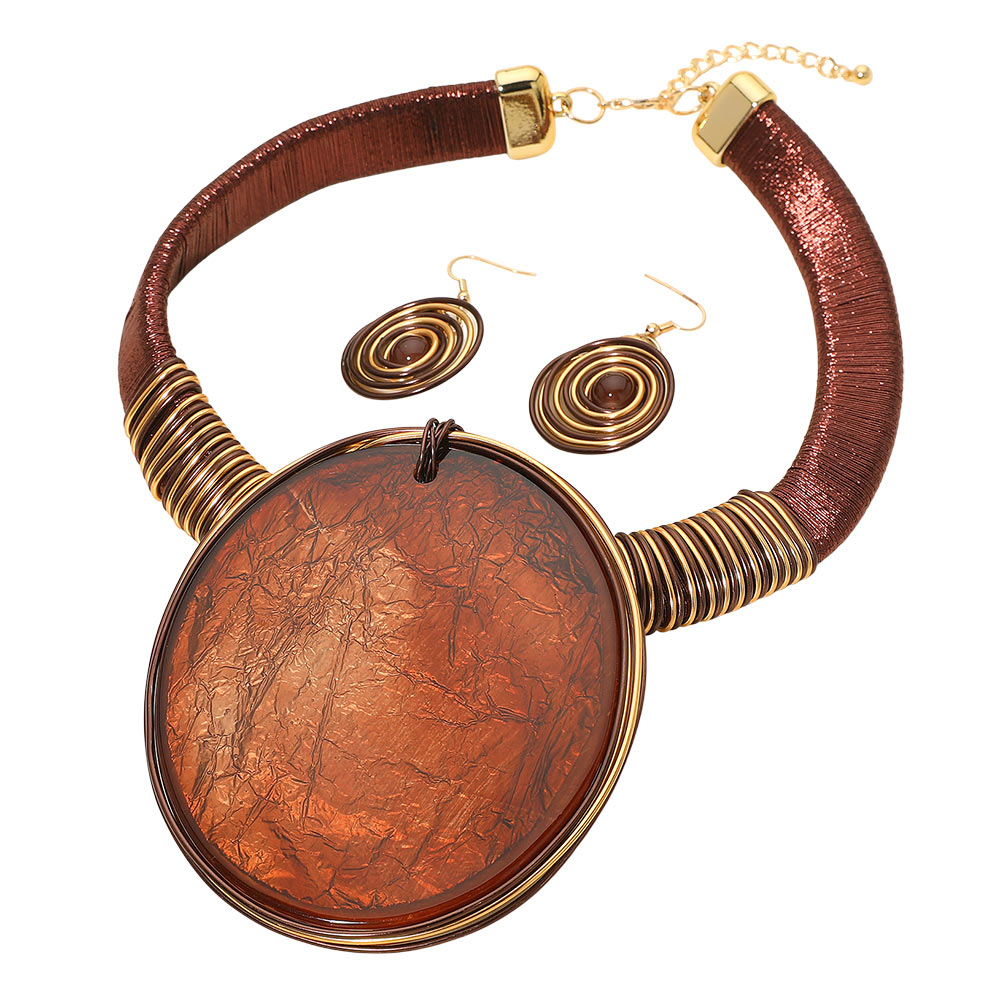 • This bold jewelry set features an oversized textured pendant paired with matching spiral earrings for a coordinated, artful look. Designed to stand out, it adds expressive style and sculptural detail to any outfit, making it ideal for special occasions or dramatic everyday wear.