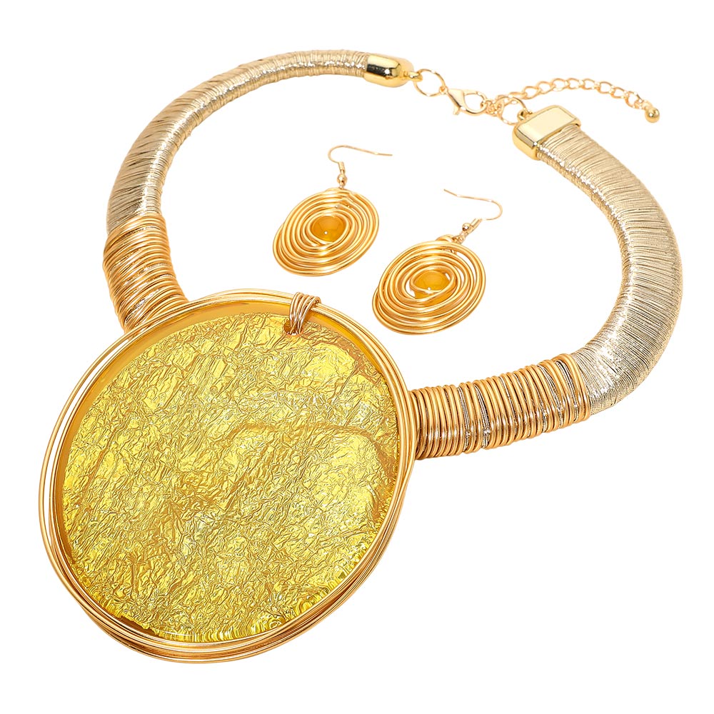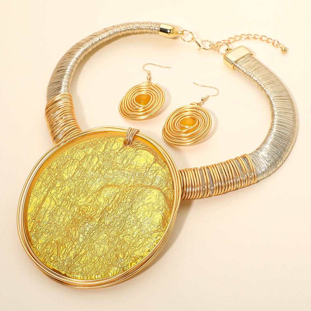 • This bold jewelry set features an oversized textured pendant paired with matching spiral earrings for a coordinated, artful look. Designed to stand out, it adds expressive style and sculptural detail to any outfit, making it ideal for special occasions or dramatic everyday wear.