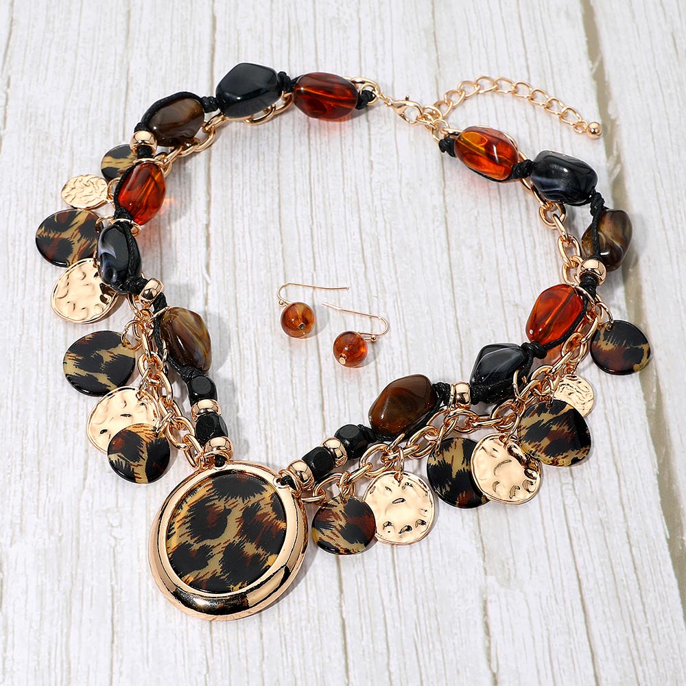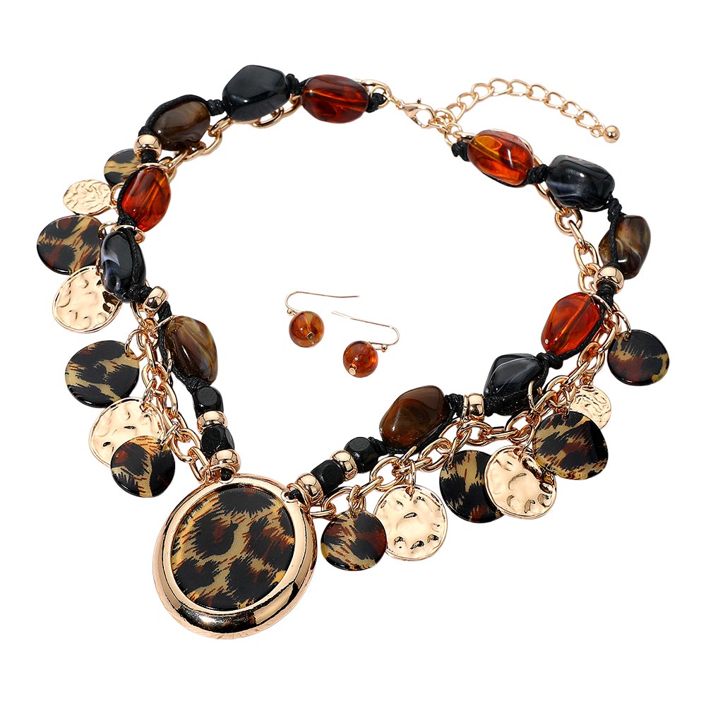 • Stand out with this layered charm necklace and earring set featuring a striking mix of patterned medallions, textured discs, and glossy beads. Its bold, fashion-forward design adds dynamic movement and rich detail, making it the perfect statement accessory for elevating any outfit with effortless flair.