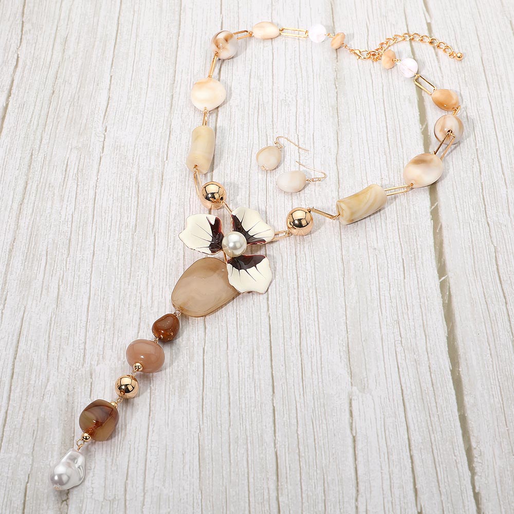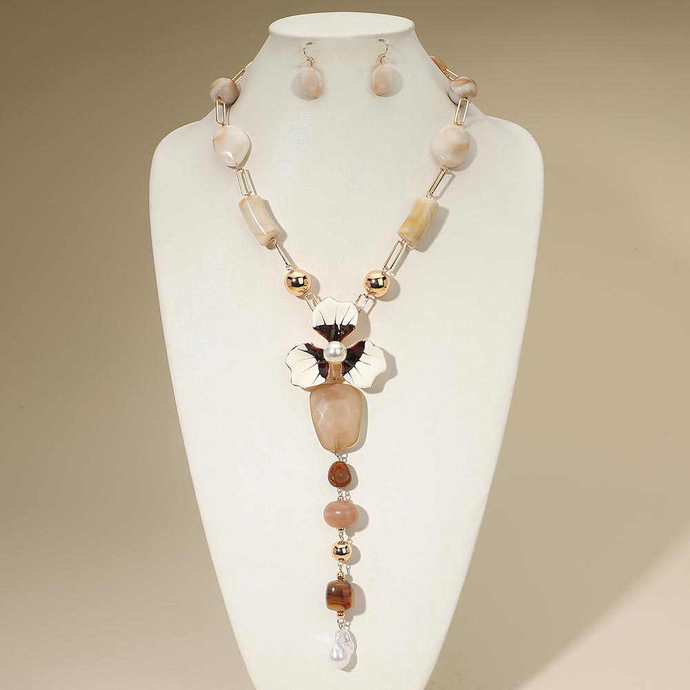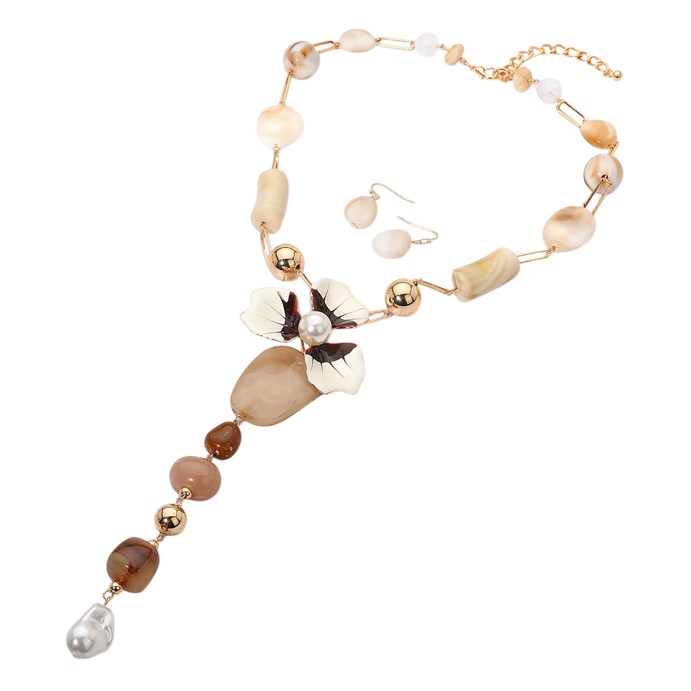 • Chic long necklace and earrings set featuring a sculpted floral pendant accented with faceted beads and metallic details. The elegant drop design and mixed shapes create a sophisticated statement piece ideal for dressing up both casual and formal outfits.