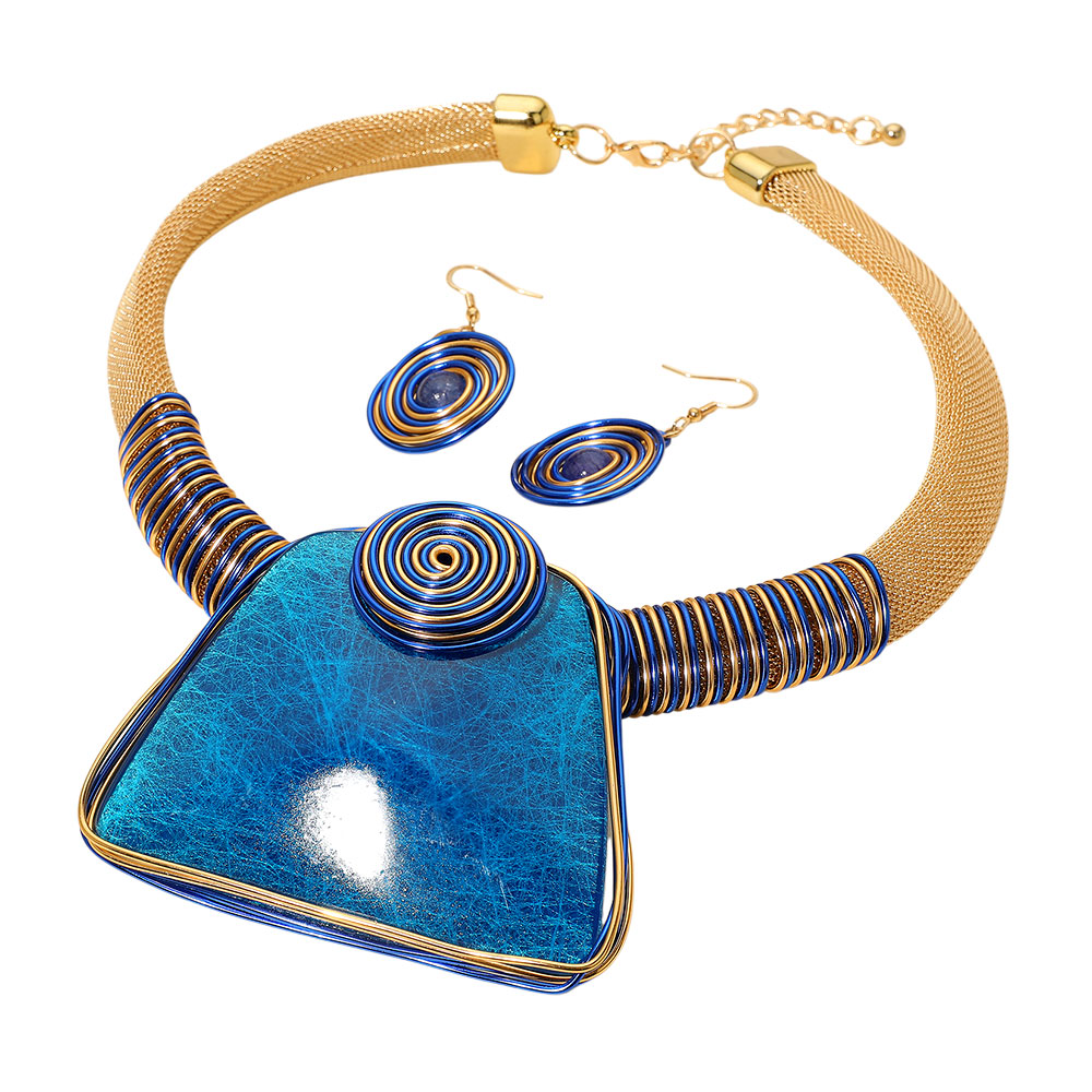 Details • Necklace Size : 18.5" + 2" L • Decor Size : 3.25" L • Earrings Size : 2.25" L • Elevate your look with this striking statement necklace and matching earrings, featuring a bold geometric pendant and artistic swirl design. Perfect for special occasions, evening wear, or adding a touch of elegance to everyday outfits. • Lead and Nickel Compliant