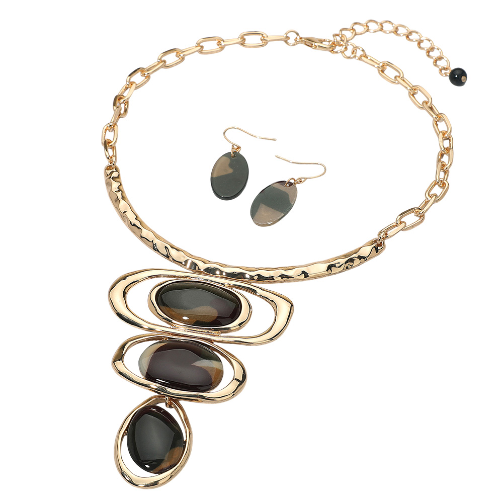 • Make a statement with this bold necklace and earrings set featuring layered geometric pendants and matching drop earrings. The striking design enhances any outfit, perfect for parties, evenings, or special occasions. Add a modern artistic touch to your jewelry collection with this stunning set.