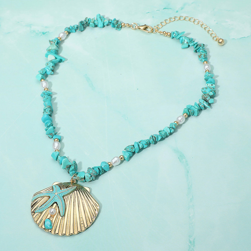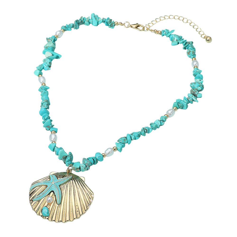 Details • Necklace Size : 18" + 3" L • Decor Size : 2.2" L • Bring coastal charm to your style with this beaded necklace featuring natural stone-like beads and a large seashell pendant accented by a starfish. Perfect for beach outings, summer festivals, or tropical vacations, this seashell pendant necklace adds a playful ocean-inspired touch to any outfit. • Lead and Nickel Compliant
