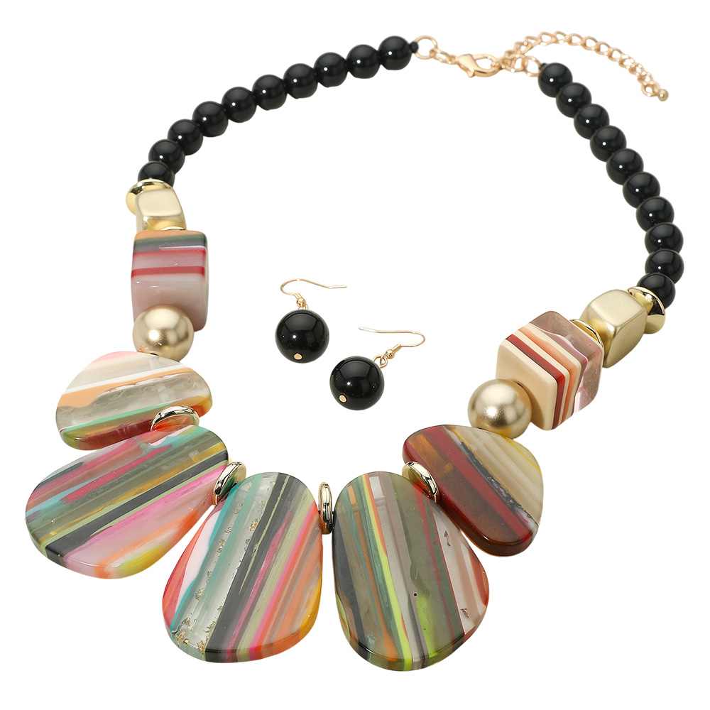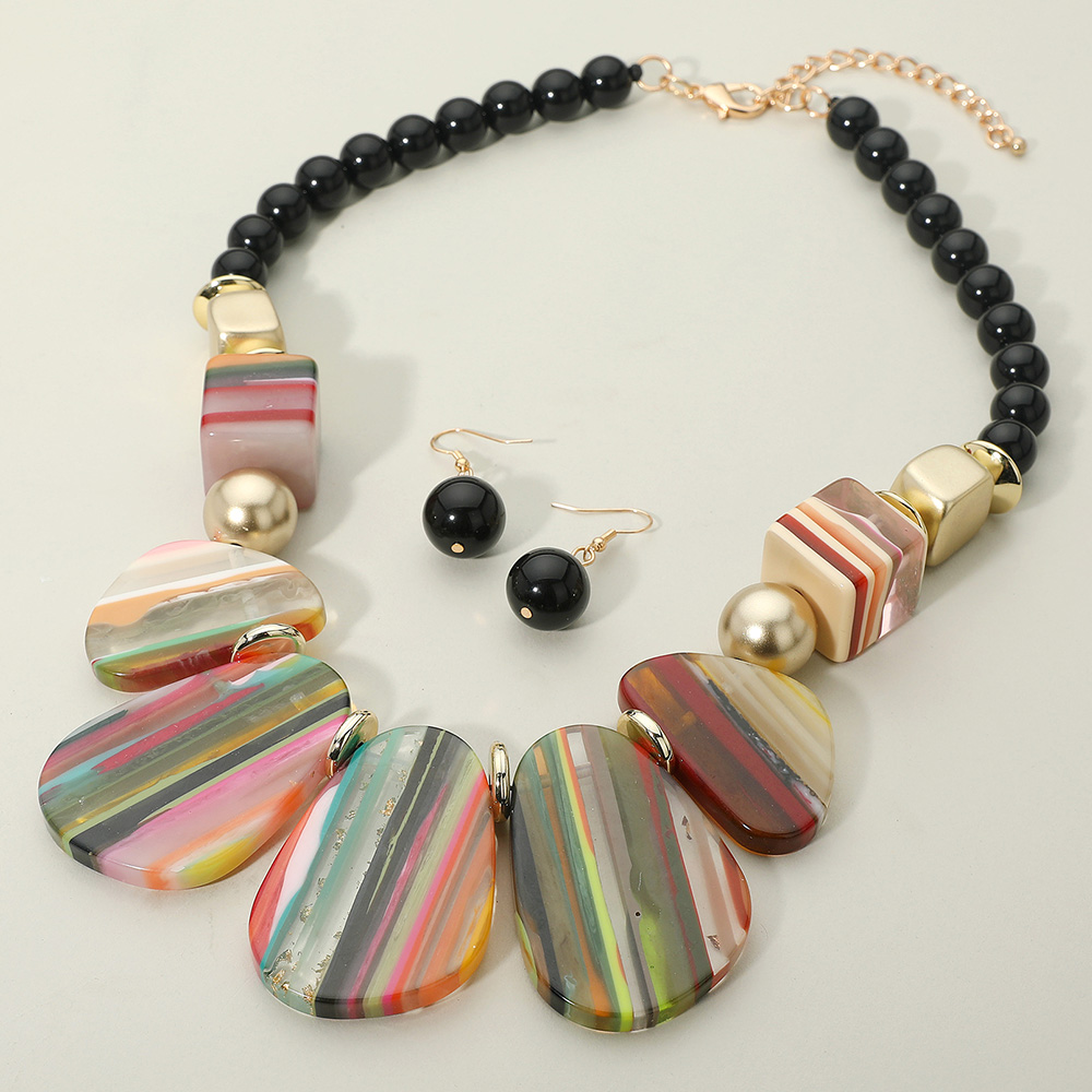 Details • Necklace Size : 21" + 3.5" L • Decor Size : 2.25" L • Earrings Size : 1.6" L • Elevate your style with this bold statement necklace featuring vibrant striped resin pendants and unique bead accents. Paired with matching drop earrings, this striking jewelry set adds artistic flair and playful charm, making it a standout choice for both casual wear and special occasions. • Lead and Nickel Compliant