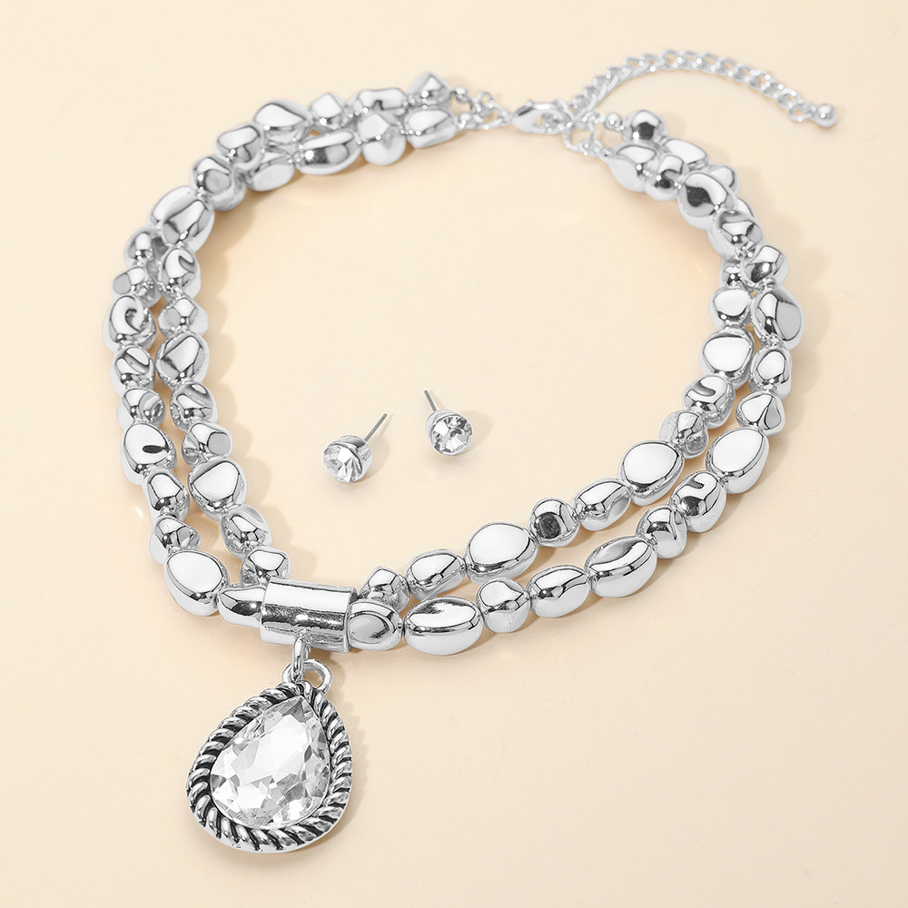Bold Teardrop Pendant Metal Pebble Beaded Double Layered Statement Necklace