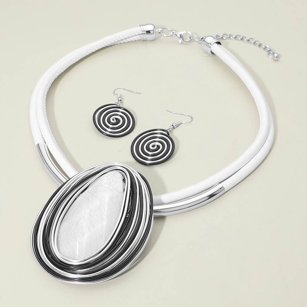 • This spiral pendant necklace and earring set features a bold sculptural design with a statement centerpiece and coordinated drop earrings. Created for standout styling, it adds modern elegance and boutique appeal, making it ideal for fashion collections, gifting, events, and trend-focused accessory assortments.