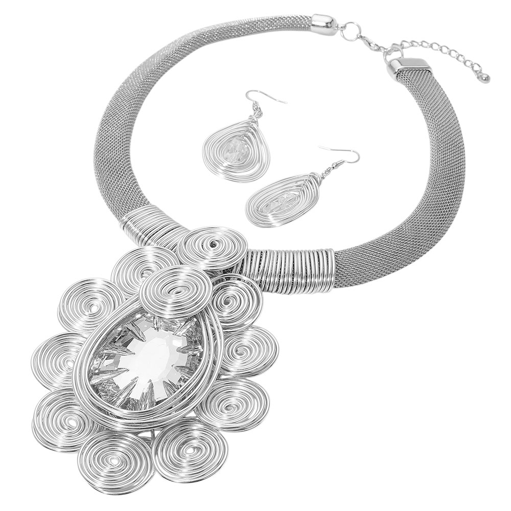 Details • Necklace Size : 18" + 2.5" L • Decor Size : 4" L • Earrings Size : 2.5" L • Make an impression with this bold teardrop statement necklace and matching earrings, featuring artistic swirl accents and a radiant centerpiece. Perfect for special occasions, parties, or elevating everyday fashion with a unique touch. • Lead and Nickel Compliant