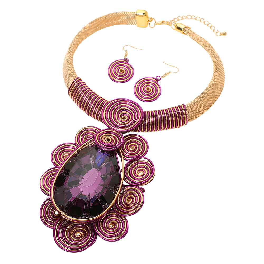 Bold Teardrop Stone Centered Metal Swirl Embellished Statement Necklace
