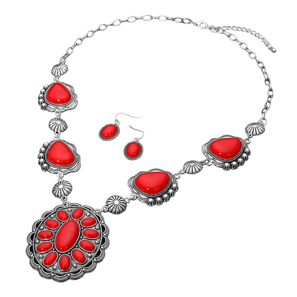 • Elevate your look with this statement jewelry set featuring a bold oval pendant necklace paired with matching drop earrings. The intricate detailing and eye-catching center accents deliver a vintage-inspired charm perfect for special events, dressy outfits, and standout styling.