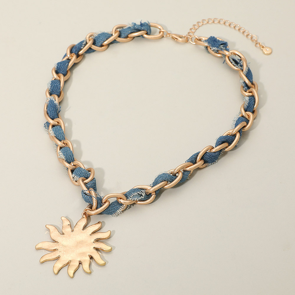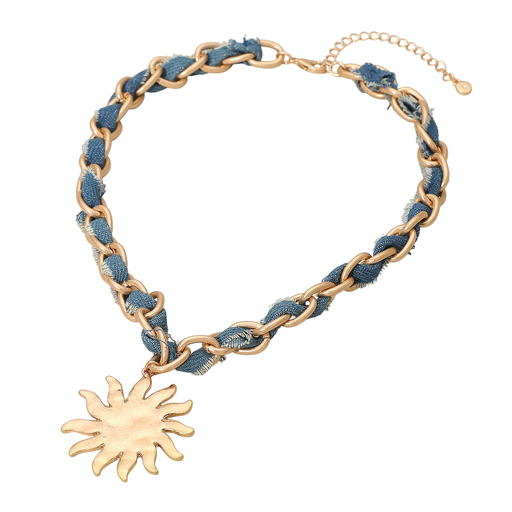 Details • Necklace Size : 18" + 3" L • Decor Size : 2.4" L • Statement necklace with denim-woven chain and large textured sun pendant, designed with an adjustable extender for a unique fashion look suitable for casual or dressed-up styling • Lead and Nickel Compliant