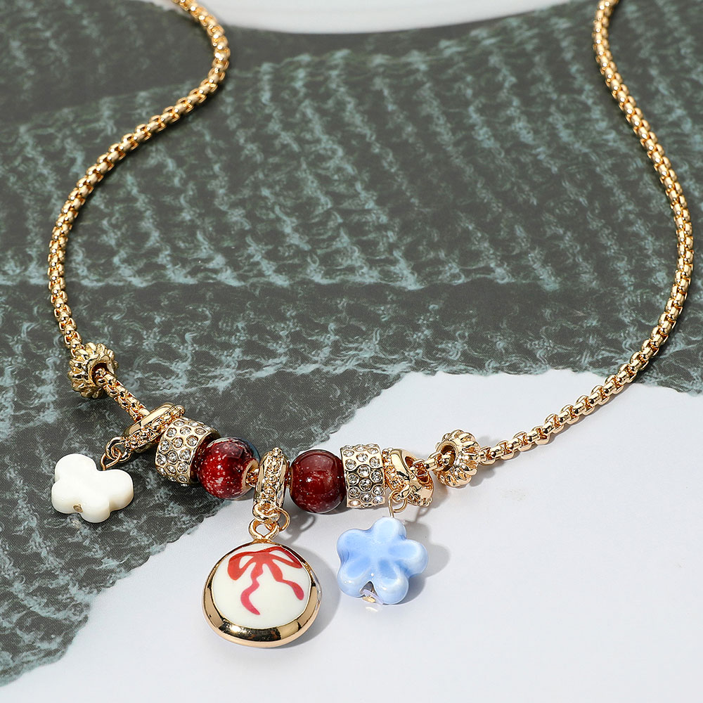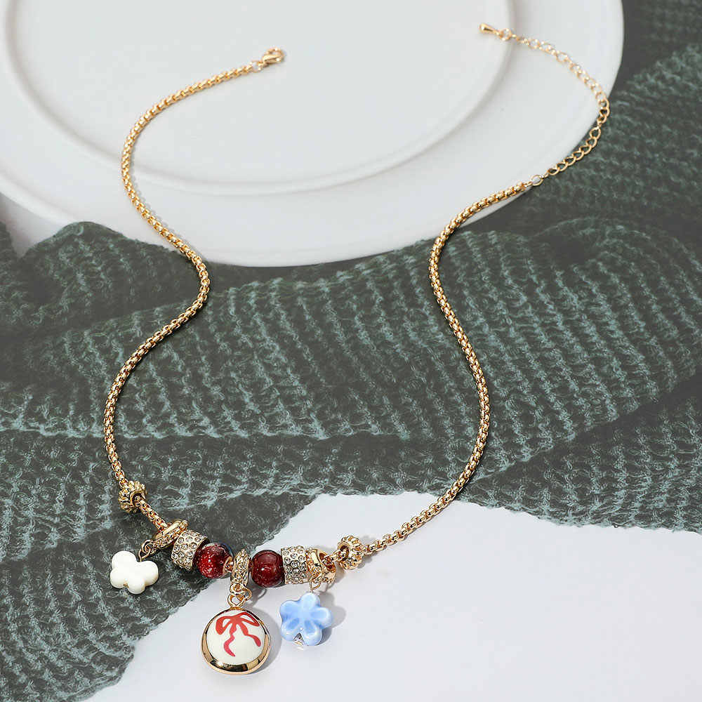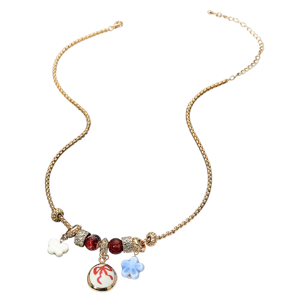 Details • Necklace Size : 16" + 3" L • Decor Size : 1.4" L • Stylish necklace adorned with floral charms, shimmering beads, and a unique decorative pendant for a chic, playful appeal. The adjustable chain design ensures a comfortable fit, making it perfect for elevating everyday looks or adding charm to special occasions. • Lead and Nickel Compliant