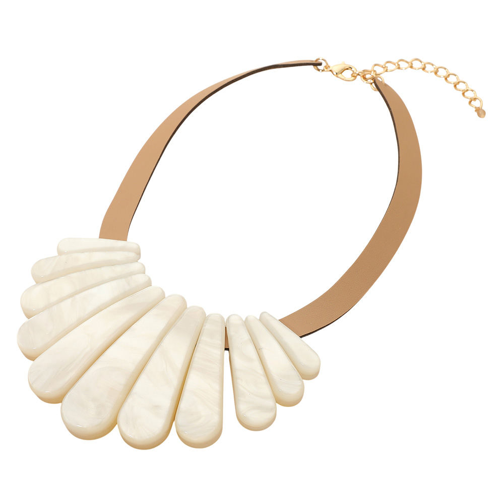 Details • Necklace Size : 19" + 3.5" L • Decor Size : 3" L • A striking statement necklace featuring sculptural fan-shaped resin pendants arranged in a graduated pattern. Bold and artistic, this unique piece elevates any outfit, making it the perfect accessory for standout style and modern elegance. • Lead and Nickel Compliant