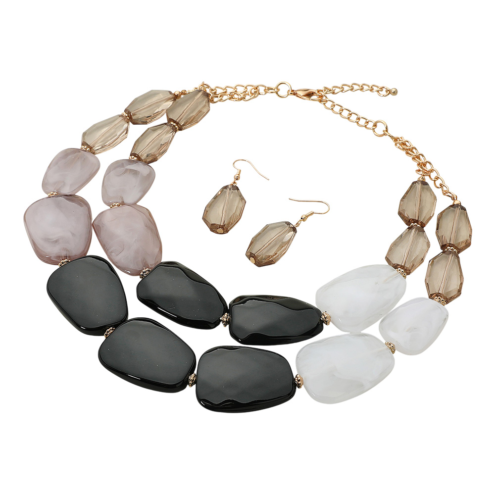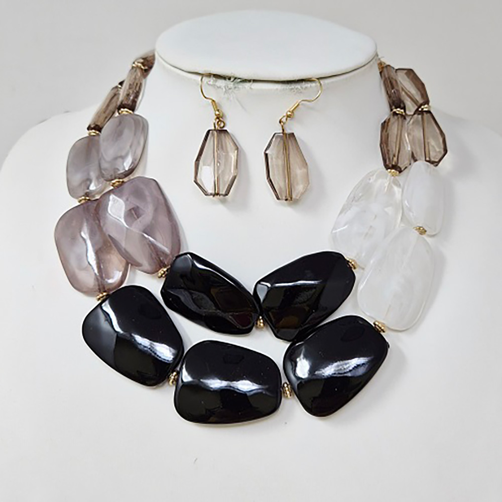 Details • Necklace Size : 17.5" + 3" L • Decor Size : 2" L • Earrings Size : 2" L • Elevate your look with this chunky beaded statement necklace set featuring bold beads in neutral tones of black, white, and smoky brown. Complete with matching drop earrings, this versatile set adds sophistication to both formal attire and chic everyday outfits. • Lead and Nickel Compliant