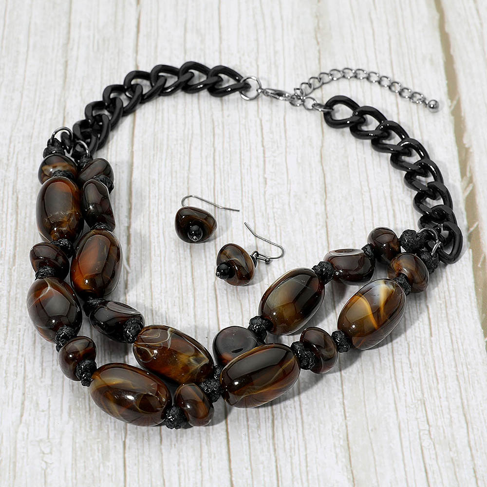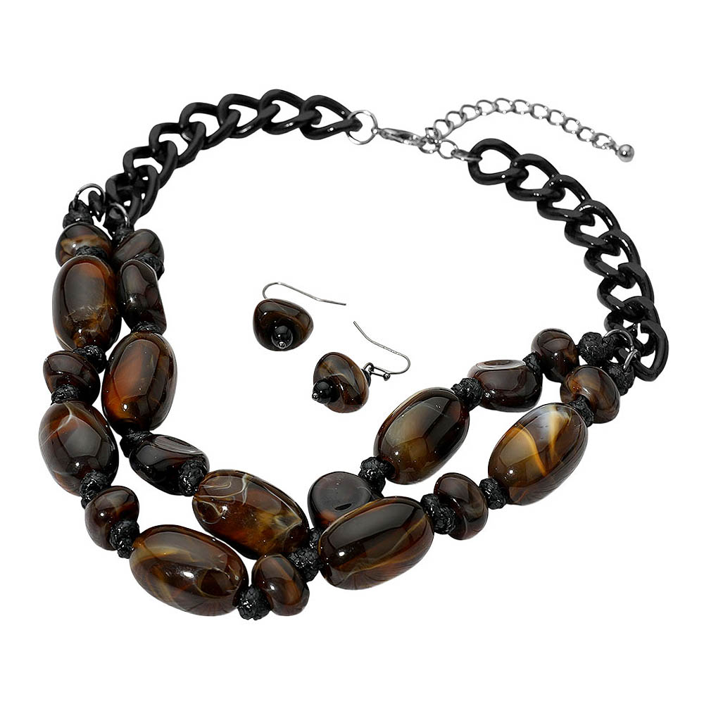 Details • Necklace Size : 18" + 3" L • Decor Size : 1.75" L • Earrings Size : 1.25" L • Bold chunky beaded necklace and earring set designed to make a statement with its striking design. Ideal for dressing up casual or evening outfits, this coordinated set adds drama and flair, making it a standout addition to any jewelry collection. • Lead and Nickel Compliant