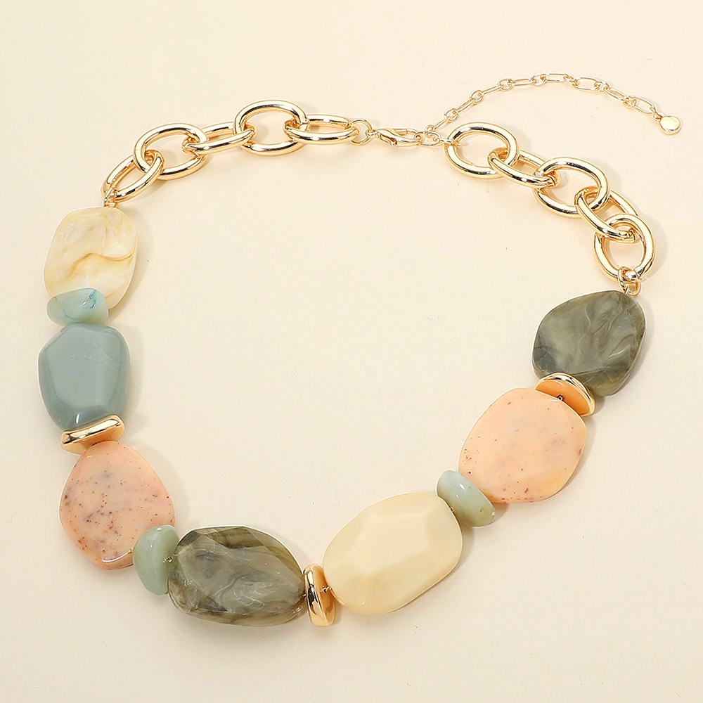 Details • Necklace Size : 16" + 3" L • Decor Size : 0.9" L • Statement necklace featuring organically shaped beads paired with bold chain accents for a modern, sculptural look. Designed with an adjustable length for flexible styling, this piece adds depth and visual interest to everyday outfits, resort wear, or elevated casual ensembles. • Lead and Nickel Compliant