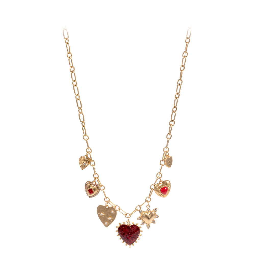 • Charming heart charm necklace featuring a mix of textured and glitter heart pendants for a playful, romantic look. Perfect for everyday wear or special occasions, this elegant necklace adds sparkle and personality to any outfit, creating a stylish and feminine statement.