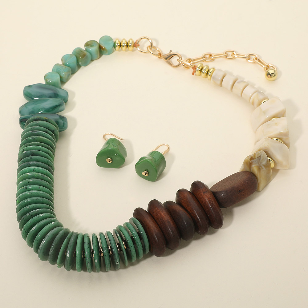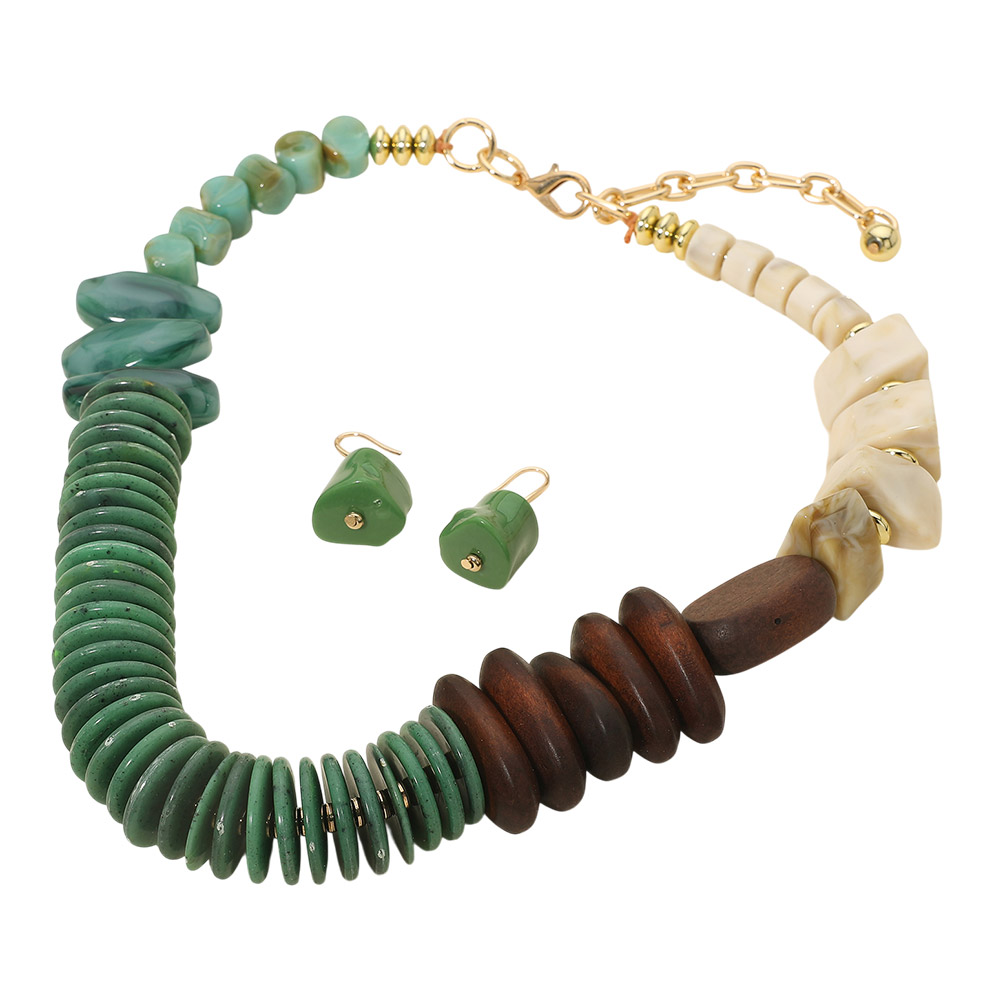 Details • Necklace Size : 22.5" + 3.5" L • Decor Size : 1.3" L • Earrings Size : 1.5" L • Statement necklace and matching earring set featuring bold, mixed bead shapes arranged in a balanced, eye-catching design. This coordinated set delivers a modern statement look that elevates casual outfits and resort-inspired styling. Ideal for boutiques seeking unique, fashion-forward jewelry sets that add texture, dimension, and visual impact to curated accessory collections. • Lead and Nickel Compliant