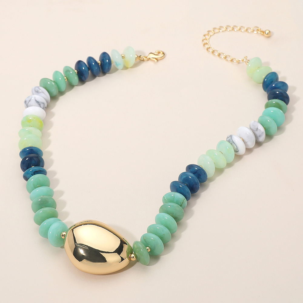 Details • Necklace Size : 18" + 3.25" L • Decor Size : 1.2" L • Eye-catching chunky necklace featuring polished beads in varied tones and a bold central pendant. Designed to elevate both casual and dressy looks, this statement piece brings modern style with a touch of elegance, making it the perfect accessory for layering or wearing solo. • Lead and Nickel Compliant