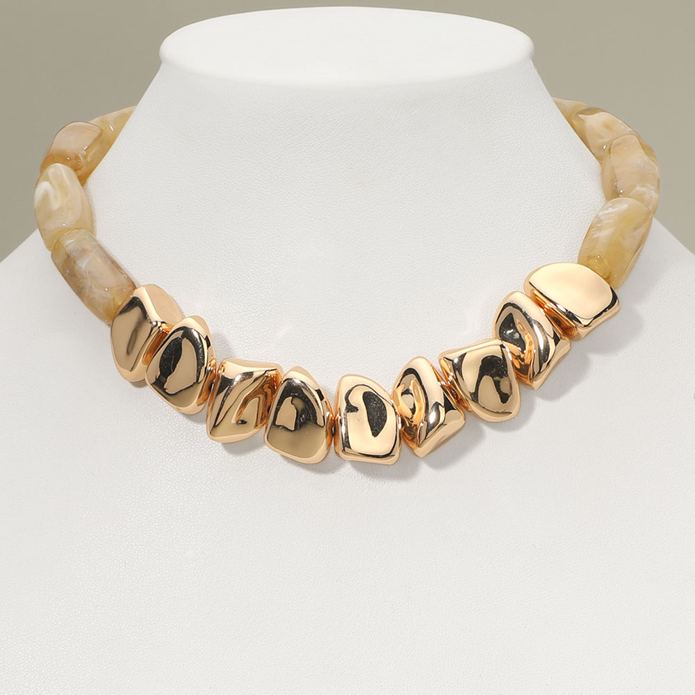 Chunky Polished Metal Marbled Resin Pebble Beaded Statement Necklace
