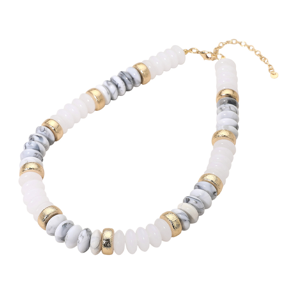 Details • Necklace Size : 17" + 3" L • Decor Size : 0.6" L • Bold and contemporary, this chunky beaded necklace features smooth disc-shaped beads with metallic gold-tone spacers. A versatile statement piece that elevates any outfit with its sleek, modern design. • Lead and Nickel Compliant