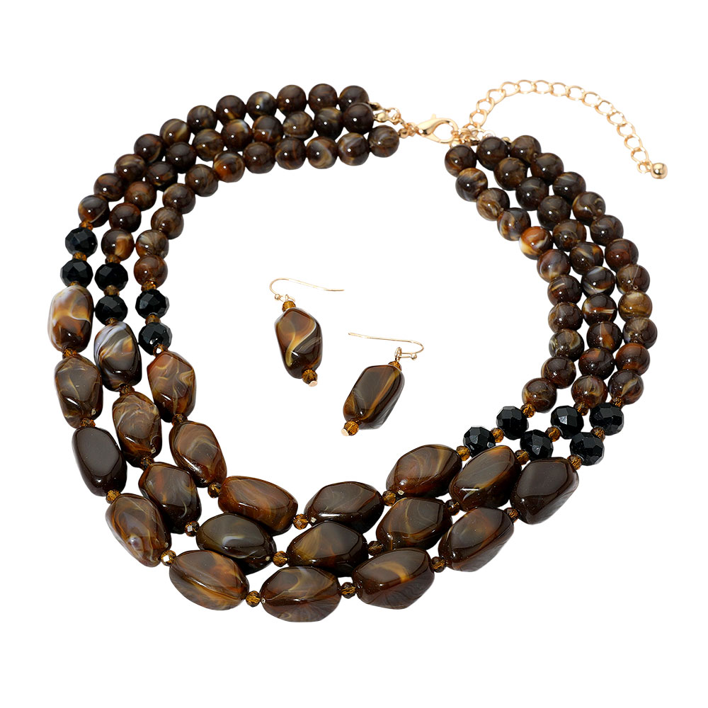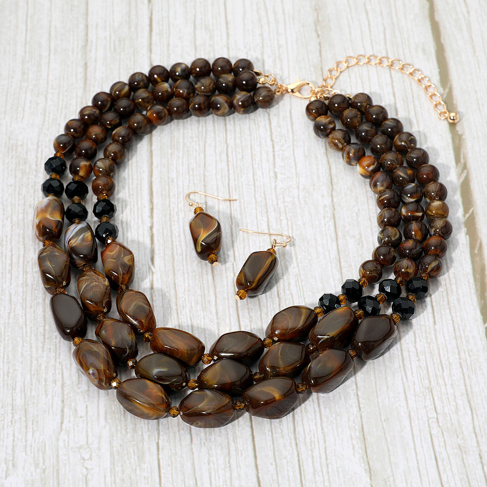 Details • Necklace Size : 16" + 3" L • Decor Size : 2" L • Earrings Size : 1.6" L • Stylish layered beaded necklace with matching earrings designed to elevate any look with its bold arrangement. Perfect for adding a touch of elegance to casual or dressy outfits, this coordinated set makes a standout addition to any jewelry collection. • Lead and Nickel Compliant