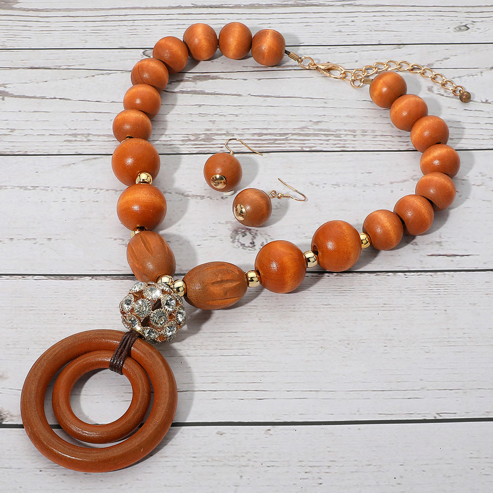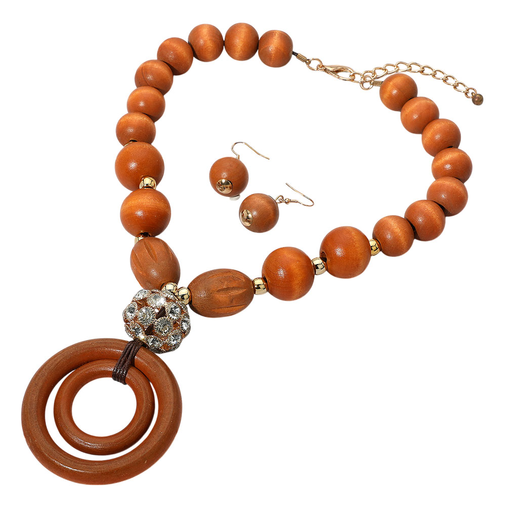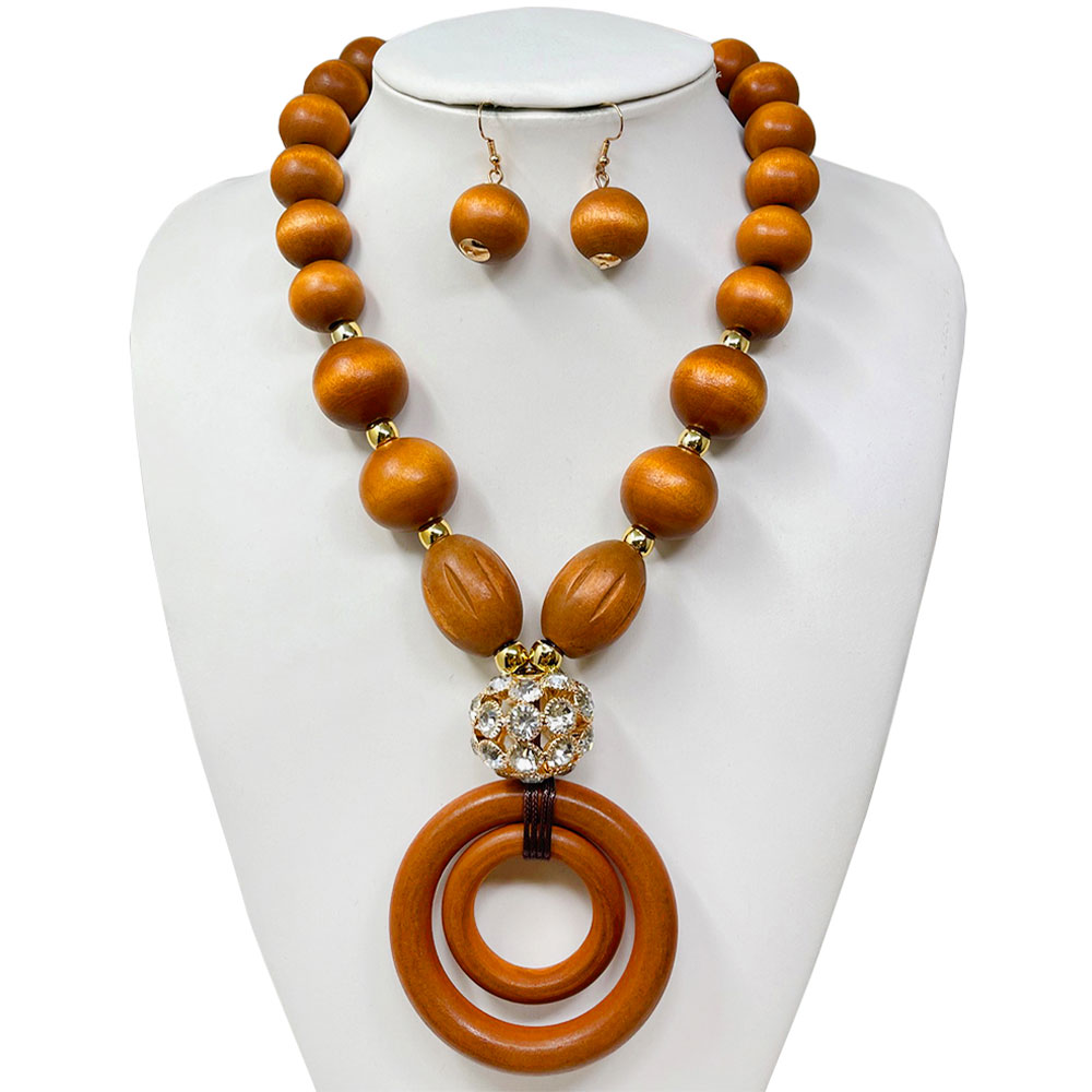 Chunky Wooden Ball Beaded Rhinestone Accent Boho Statement Necklace