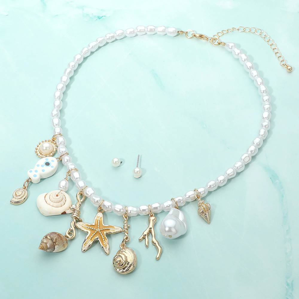 Details • Necklace Size : 17" + 3.25" L • Decor Size : 2.25" L • Earrings Size : 0.2" L • Playful charm necklace and stud earring set featuring bead-style accents and a mix of seaside-inspired motifs arranged for movement and layered interest. Designed to add personality to everyday outfits, vacation looks, and casual styling, this set delivers standout appeal for boutique accessory collections. • Lead and Nickel Compliant