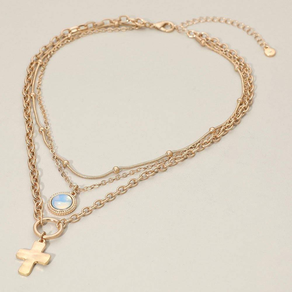 Details • Necklace Size : 14.5" + 3.5" L • Decor Size : 3.4" L • Enhance everyday style with this layered cross charm necklace, featuring multiple delicate chains paired with a classic cross accent and a glowing round detail for added depth. Ideal for effortless layering or wearing solo to create a polished, on-trend look suited to casual or dressy outfits. • Lead and Nickel Compliant