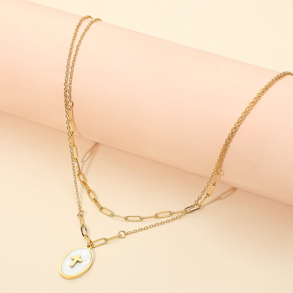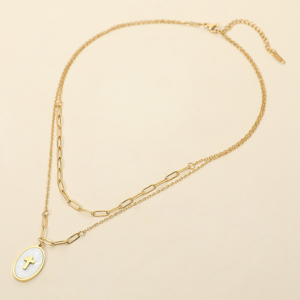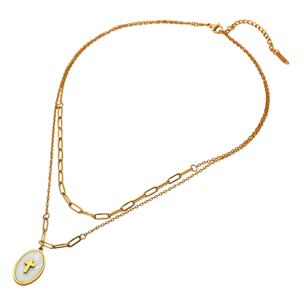 Details • Necklace Size : 16.5" + 2.5" L • Decor Size : 2.3" L • Water and Tarnish Resistant • Stylish layered chain necklace featuring a bold oval pendant with a cross design. Perfect for everyday wear or as a meaningful accessory, this piece combines modern elegance with timeless symbolism. • Stainless Steel