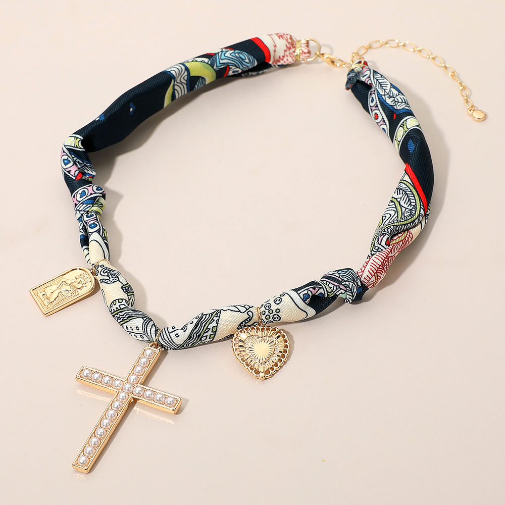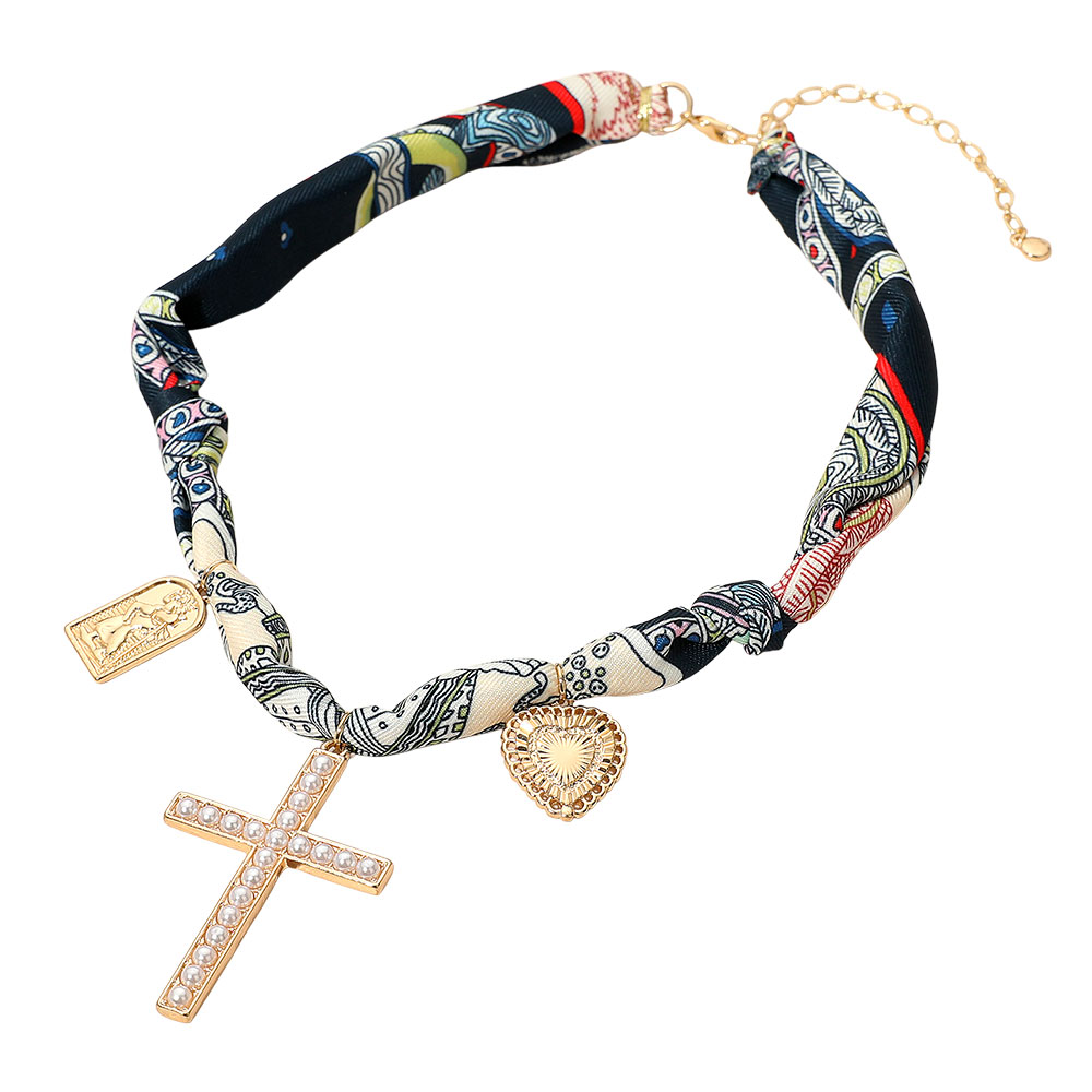 Details • Necklace Size : 16" + 3" L • Decor Size : 2.25" L • Pattern May Vary • Stylish twisted necklace featuring a patterned band adorned with elegant pendants including a cross, heart, and charm. A bold accessory that adds unique flair to casual or dressy looks, perfect for layering or wearing alone. • Lead and Nickel Compliant