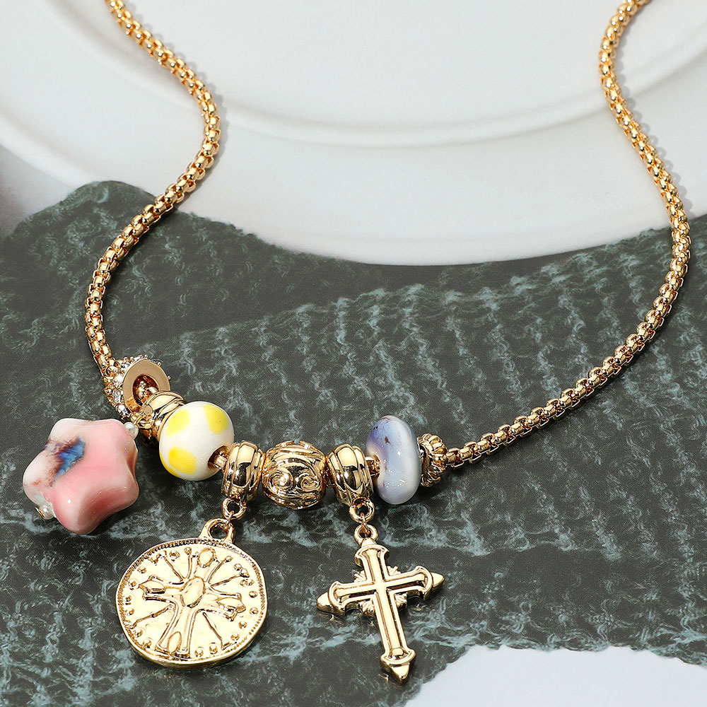 Details • Necklace Size : 16" + 3" L • Decor Size : 1.6" L • Stylish necklace featuring a medallion, cross charm, and colorful bead accents for a meaningful yet fashionable design. The adjustable chain ensures a comfortable fit, making it a perfect accessory for daily wear or as a thoughtful, symbolic gift. • Lead and Nickel Compliant