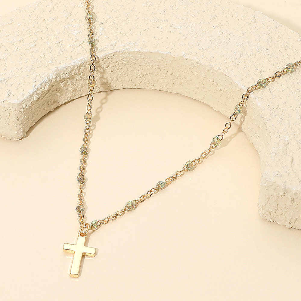 • A delicate cross pendant necklace designed with subtle beaded detailing for a refined touch. Its lightweight, graceful silhouette makes it ideal for everyday wear or layering, offering a meaningful accent that blends effortlessly with any personal style.