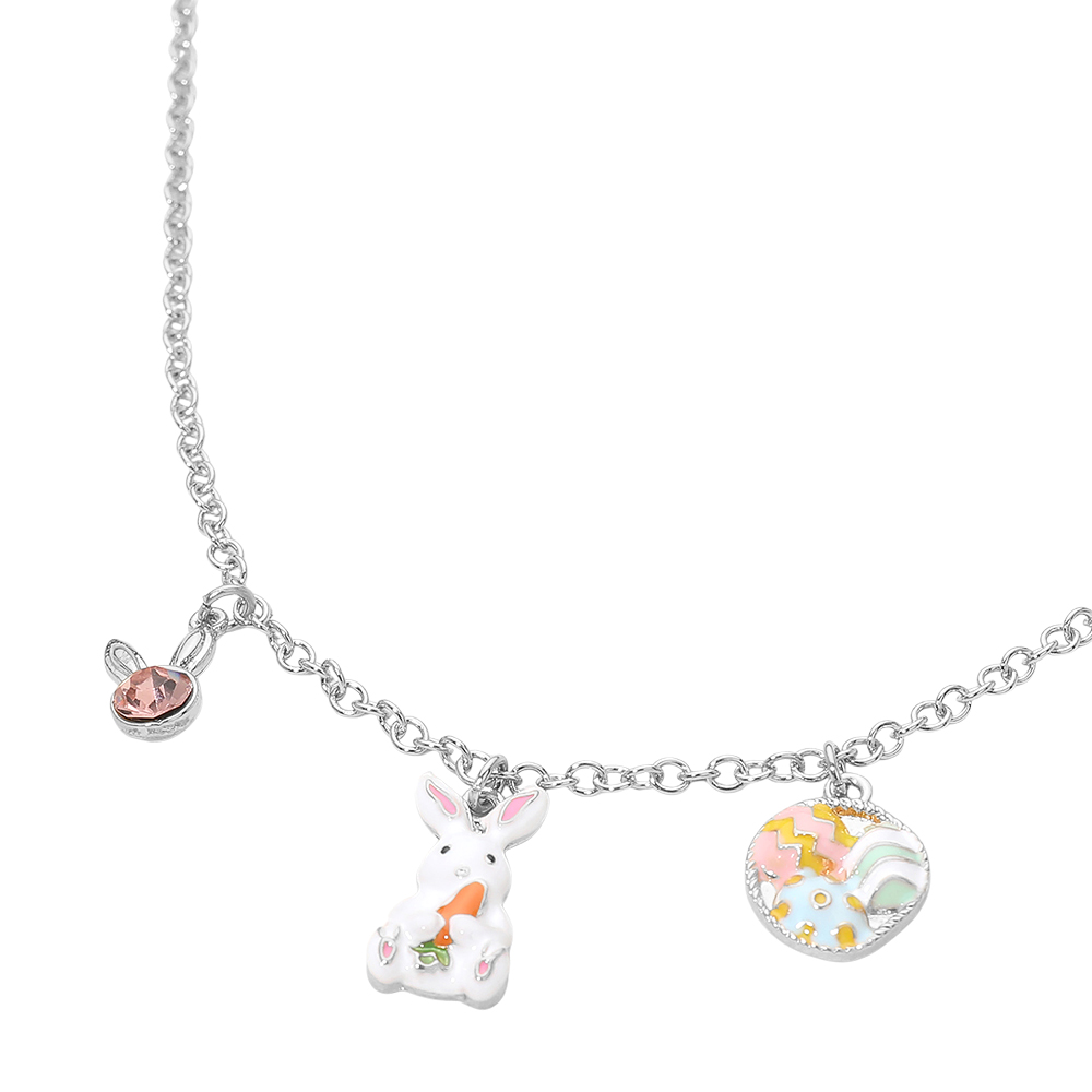 Details • Necklace Size : 18" + 3.25" L • Decor Size : 0.75" L • Easter bunny charm necklace featuring playful seasonal motifs designed to bring cheerful character to spring styling. A fun statement piece ideal for holiday outfits, gifting, or themed displays. Perfect for boutiques seeking festive jewelry that adds charm, personality, and seasonal appeal. • Lead and Nickel Compliant