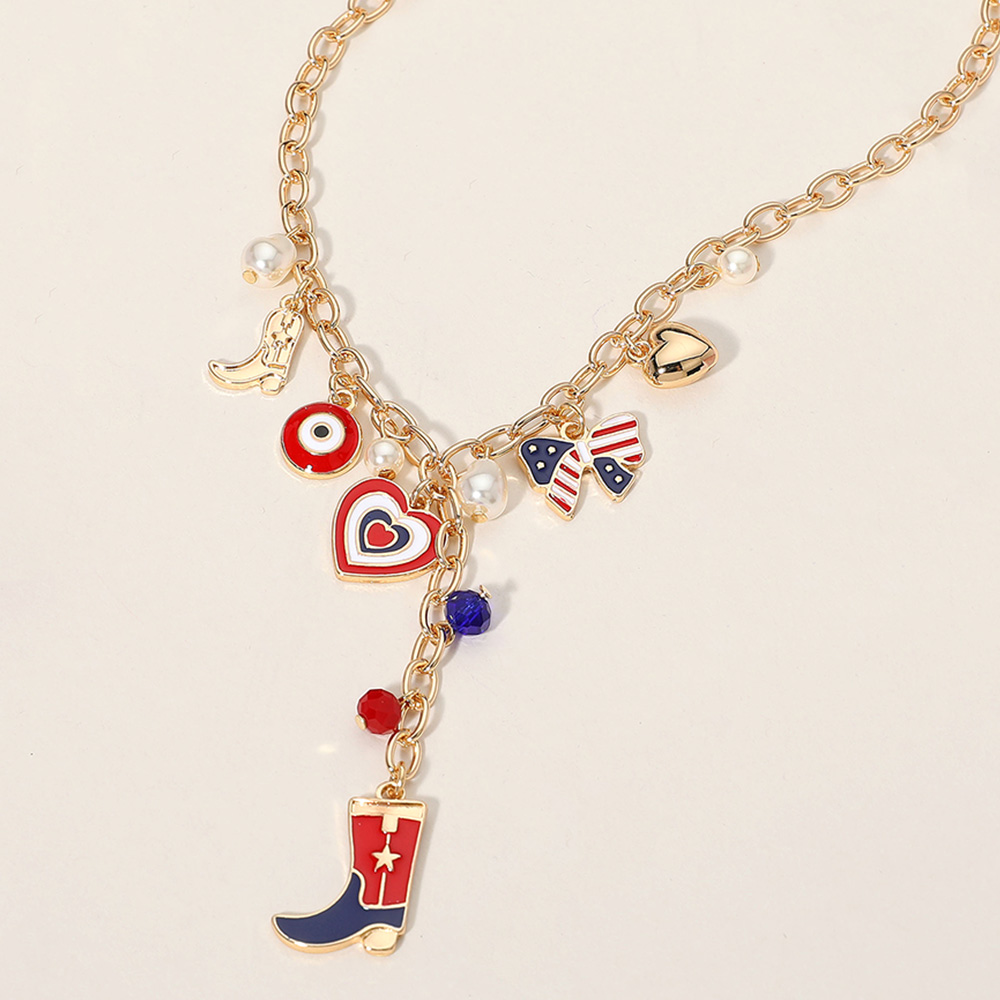 Enamel American USA Flag Western Cowboy Boot Bow Heart Pearl Charm Station Necklace