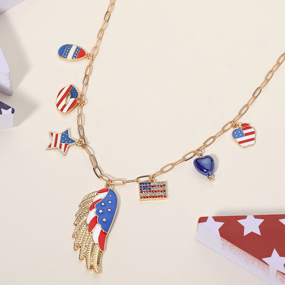 Enamel American USA Flag Wing Star Egg Heart Lips Apple Charm Station Paperclip Chain Necklace