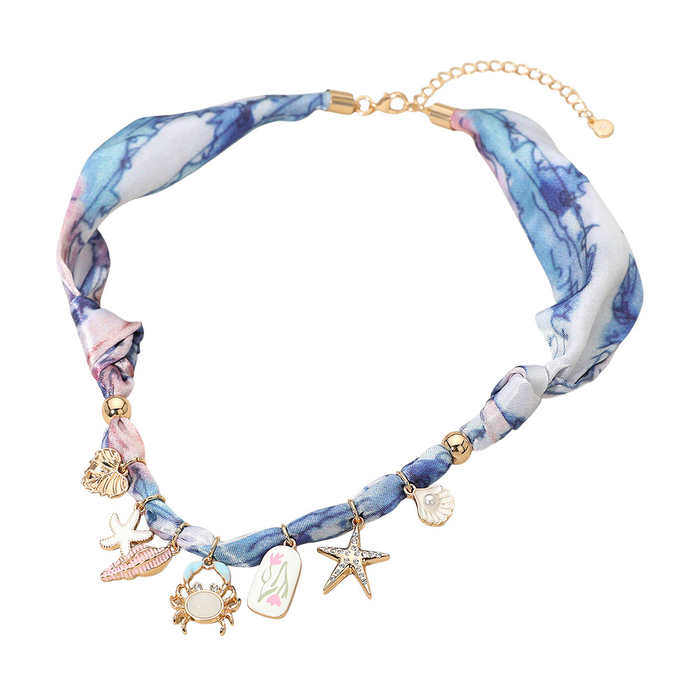 Details • Necklace Size : 18" + 3" L • Decor Size : 1" L • Print may vary • Fabric-wrapped charm necklace featuring starfish, shell, crab and coastal-inspired accents. Adjustable design adds a soft, stylish touch to any outfit. A unique accessory perfect for seaside themes, gifting, or elevating casual looks without mentioning color or material. • Lead and Nickel Compliant