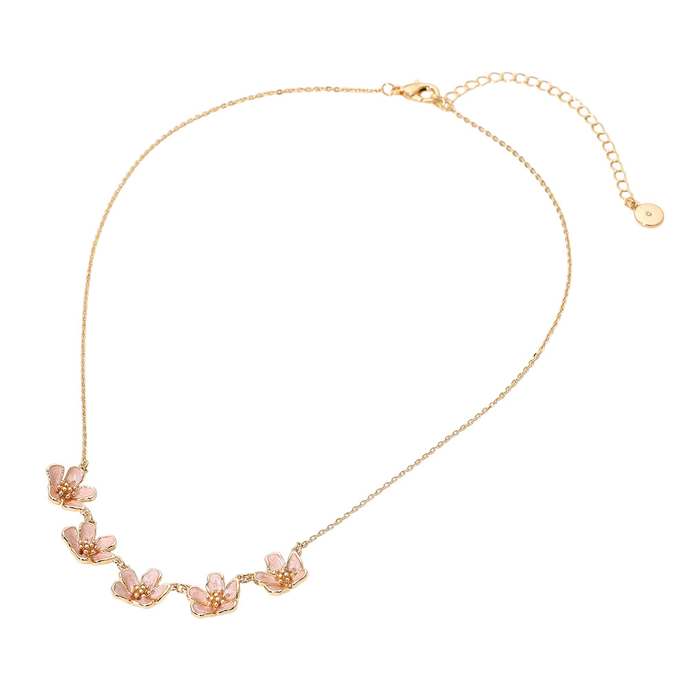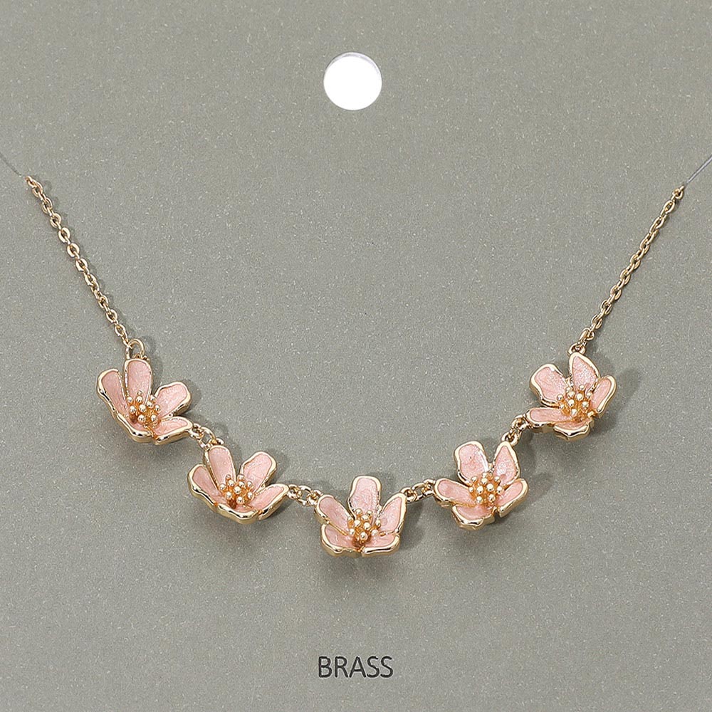 Details • Necklace Size : 16" + 3" L • Decor Size : 0.4" L • Elevate everyday style with the Floral Charm Station Necklace, featuring a series of delicate blossom accents set along a fine chain for graceful movement and subtle sparkle. Perfect for layering or wearing solo as a feminine statement piece. • Brass • Lead and Nickel Compliant