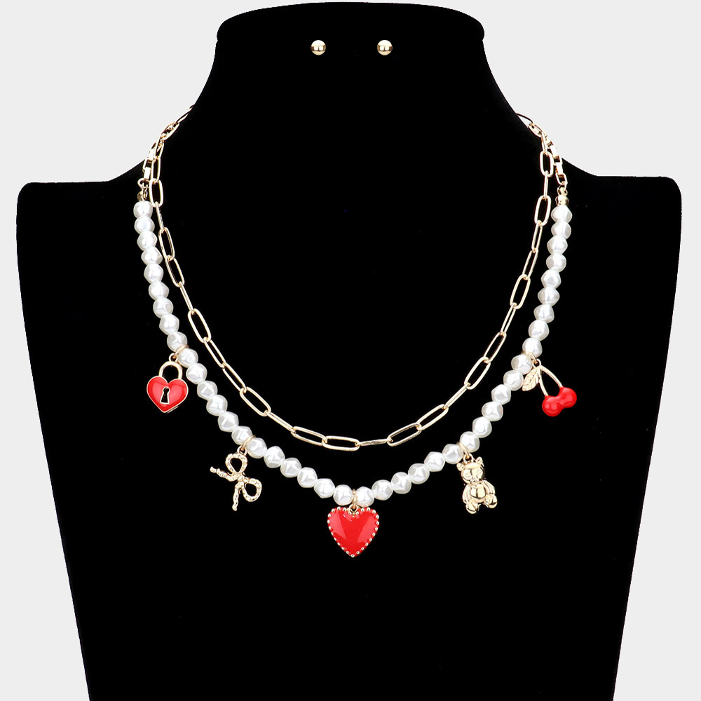 Details • Necklace Size : 16" + 2" L • Pendant Size : 0.5" X 0.5" • Earring Size : 0.2" L • Chic layered necklace featuring a mix of chain and beaded strands with heart and charm details. Ideal for adding romantic and playful touches to any outfit, perfect for casual or dressy occasions. • Lead and Nickel Compliant