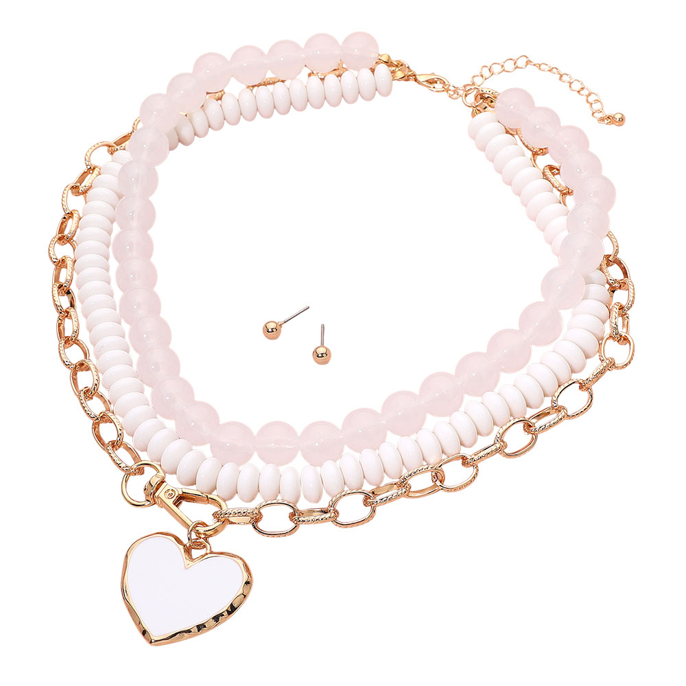 Details • Necklace Size : 17" + 3" L • Decor Size : 4" L • Pendant Size : 1.25" X 1.25" • Earrings Size : 0.2" L • Chic heart charm necklace styled with layered chunky beads and an oval chain design that creates eye-catching depth and fluid movement. Easily transitions from casual daytime outfits to polished evening looks, making it ideal for statement solo wear or on-trend layered styling. • Lead and Nickel Compliant
