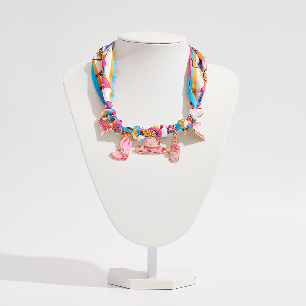 Details • Size : 26.5" L • Charm Size : 1.75" L • Print may vary • A versatile scarf accessory that transforms into a necklace, bracelet, or bag charm. Designed with a printed scarf and western-inspired charms, it brings authentic detail and unique style. Available in 2 bold designs, it adds a distinctive touch to any look. • Brass • Gold Dipped • Hypoallergenic • Lead and Nickel Compliant • Made In Korea